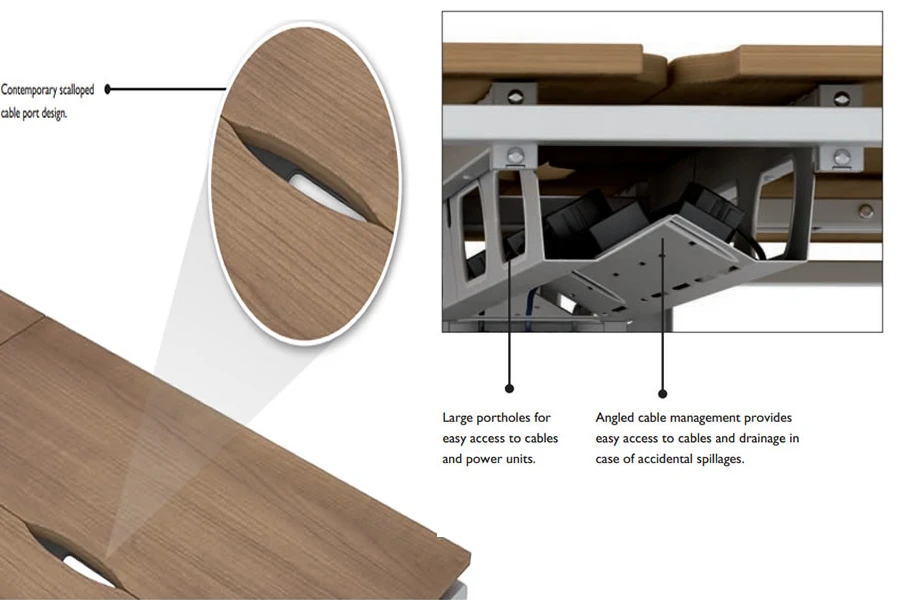 The Aura Beam is designed to make your work easier and more enjoyable. It comes with integrated cable management that runs along the entire length of the desk, allowing you to connect your devices without any hassle or mess. It also allows you to share the desk with another person if needed, without any interference from the legs.