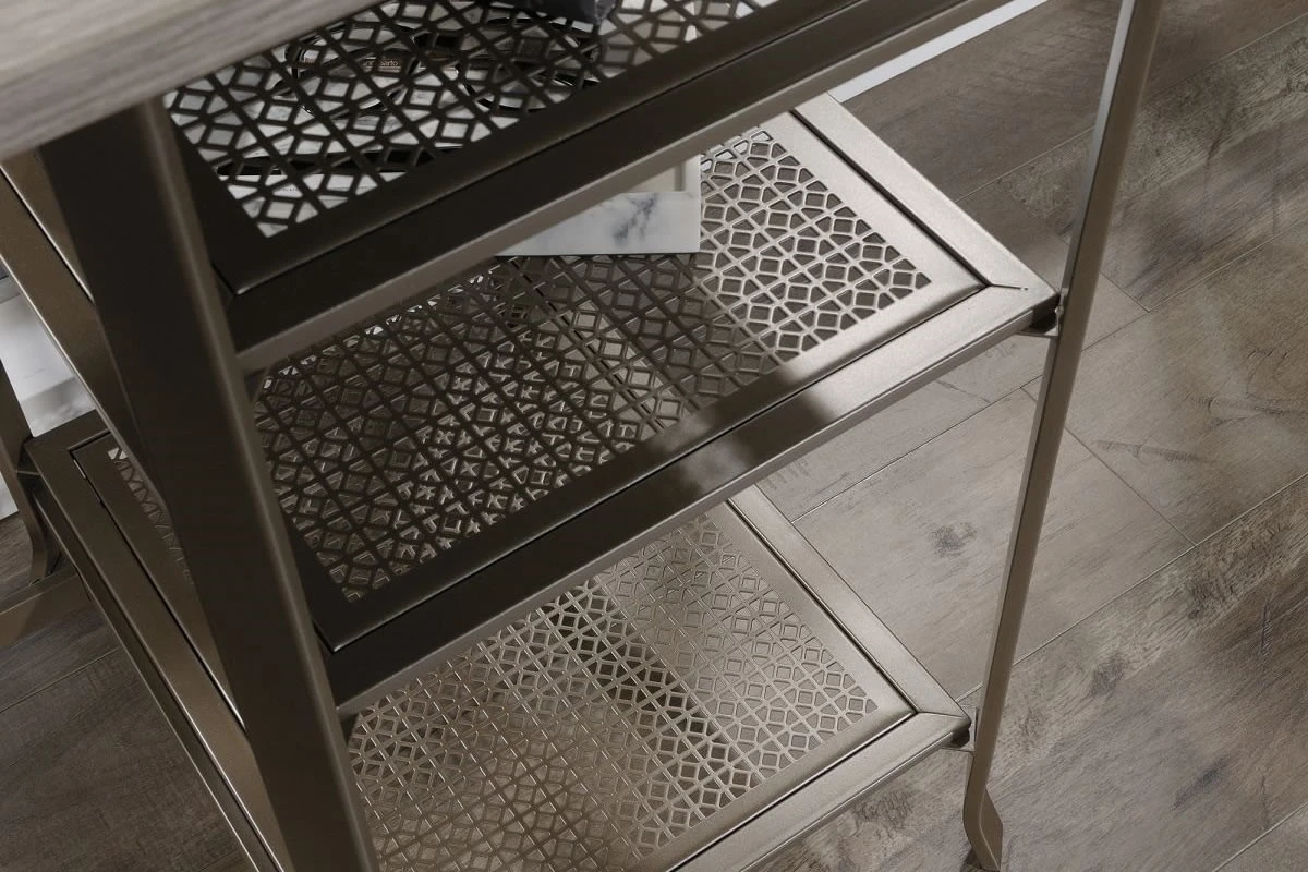 The durable satin taupe-coloured metal frame has perforated metal construction and can be assembled with the shelves on the left or the right, ideal for versatility and design options.