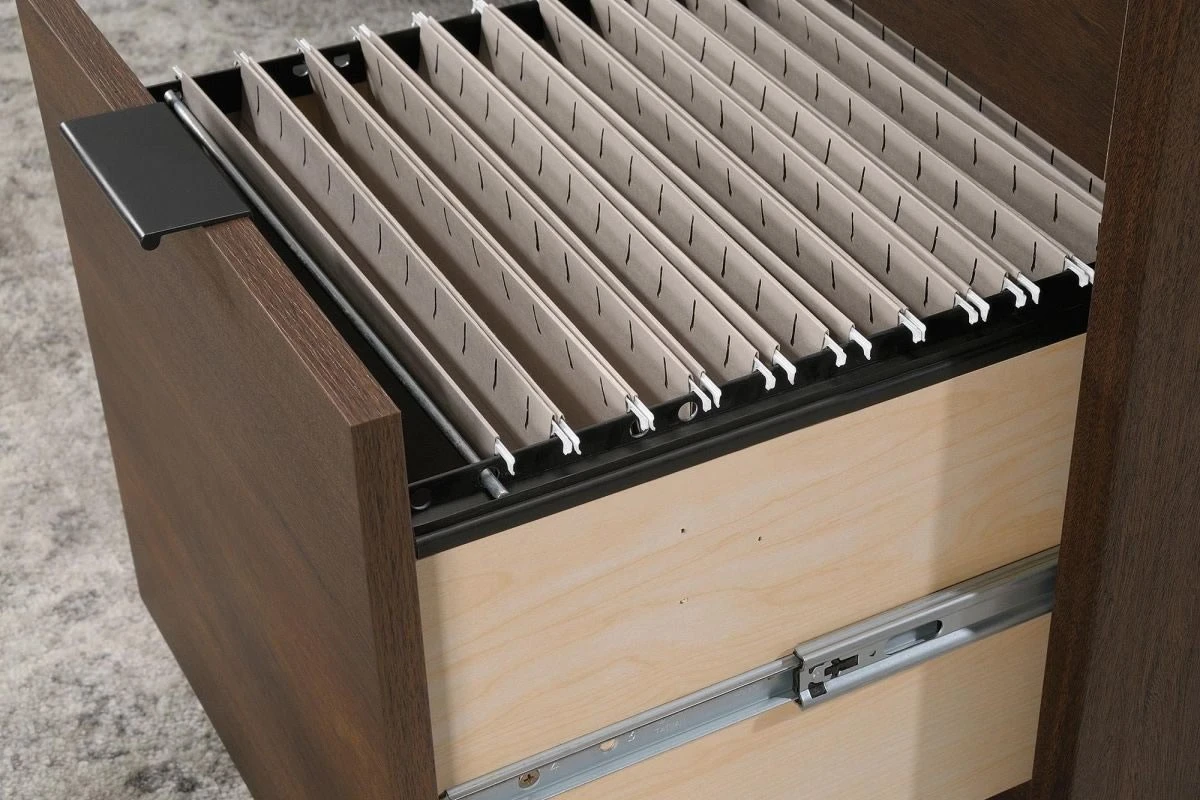 - Lower filing drawer with full extensions slides holds letter or legal size hanging files
