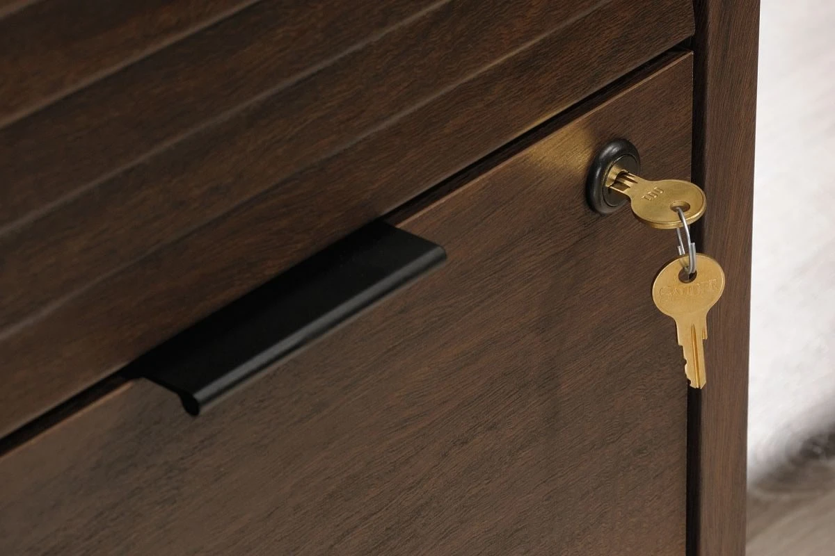 - Lockable lower filing drawer with full extensions slides holds letter or legal size hanging files