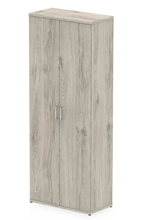 The cupboard is made from durable MFC board that is easy to clean and maintain. It has a grey oak finish that can match any office decor. It comes in different heights to suit your preferences. The 1200mm high has 2 shelves, the 1600mm high has 3 shelves, and the 2000mm high has 4 shelves.