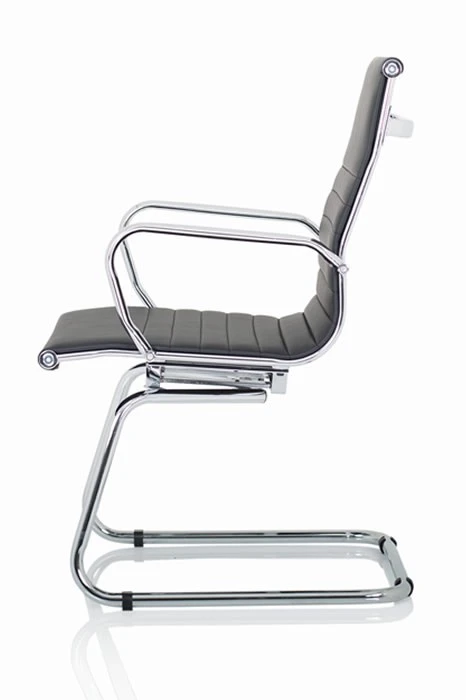 The Hiero designer visitor chair with its soft supple faux leather and deeply padded seat and back gives excellent comfort. The bright chrome armrests give this chair a classic designer look.