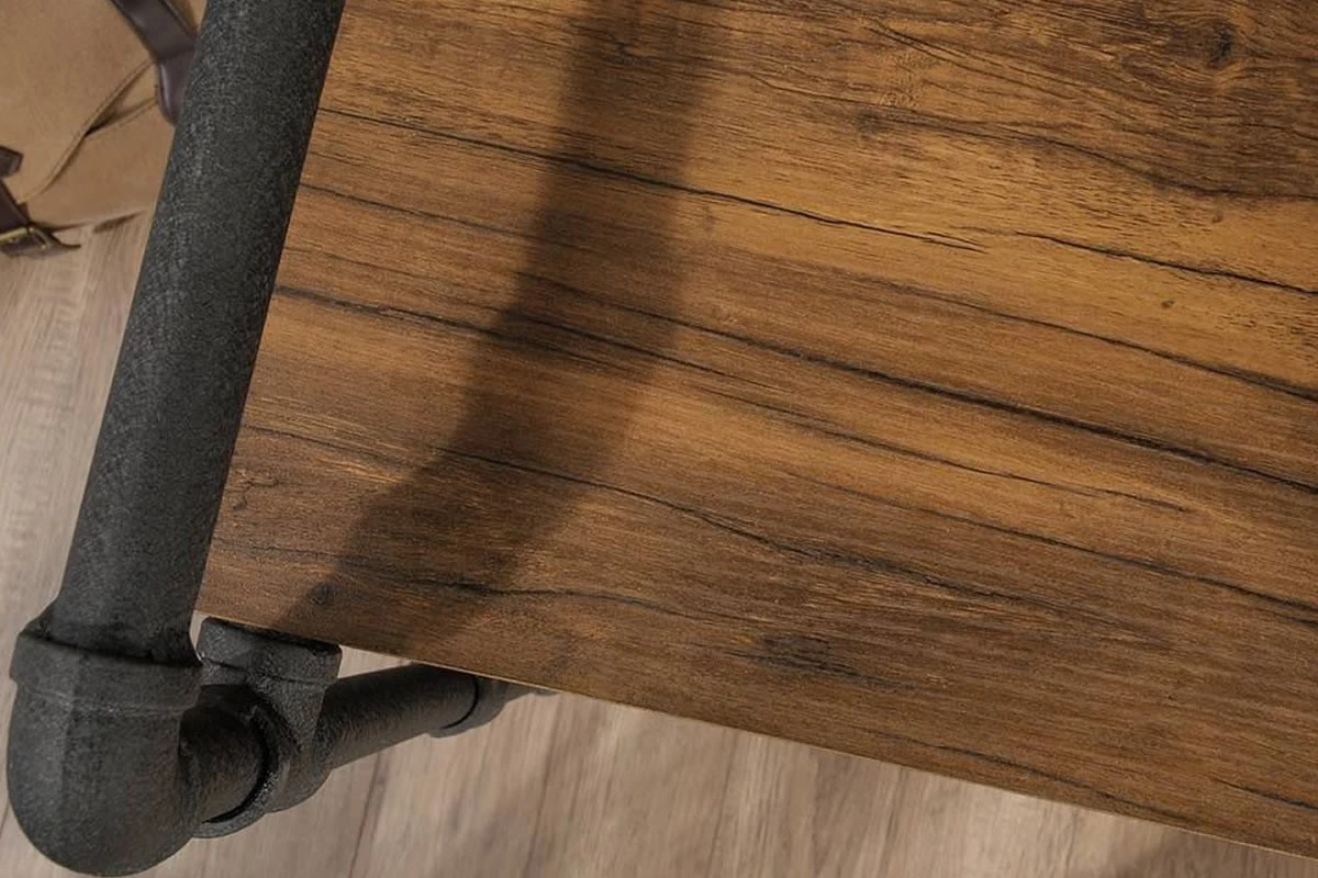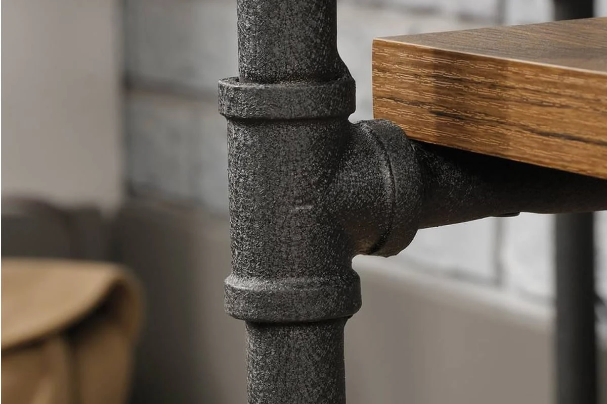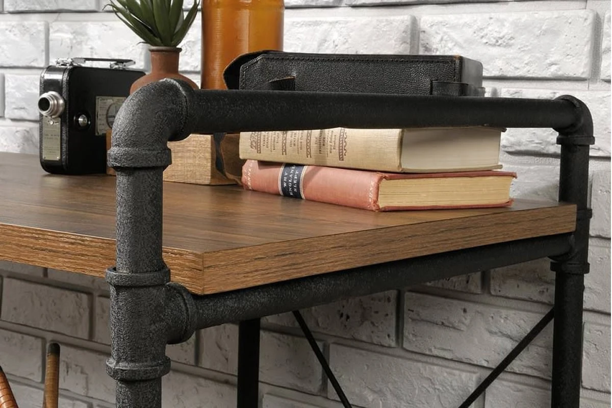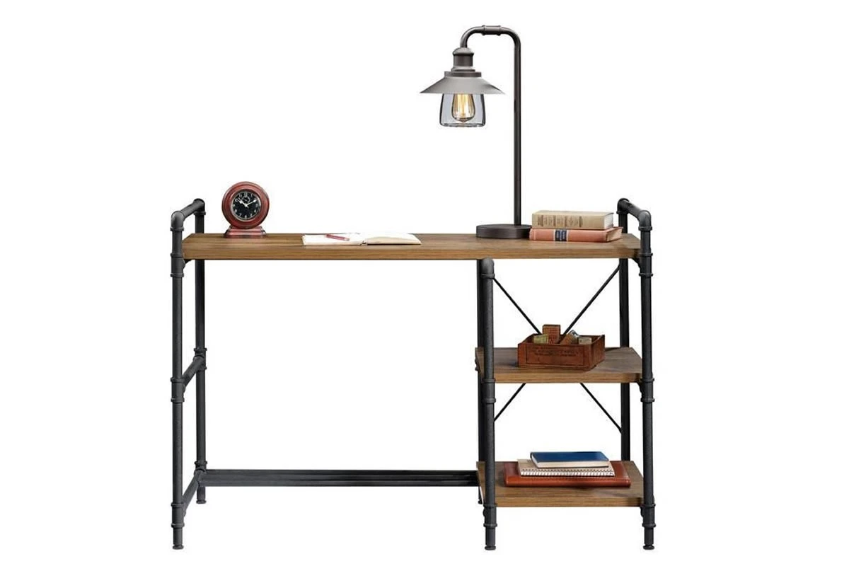 This durable yet sleek-looking desk provides a neat workspace for all manner of office studies. The neutral and sturdy textured powder-coated metal pipe framework brings a certain industrial chic to your work area and coupled with the checked oak effect 1″ thick desktop and matching storage shelves, you can ensure it’s a perfect and practical match for all rooms and colour schemes.