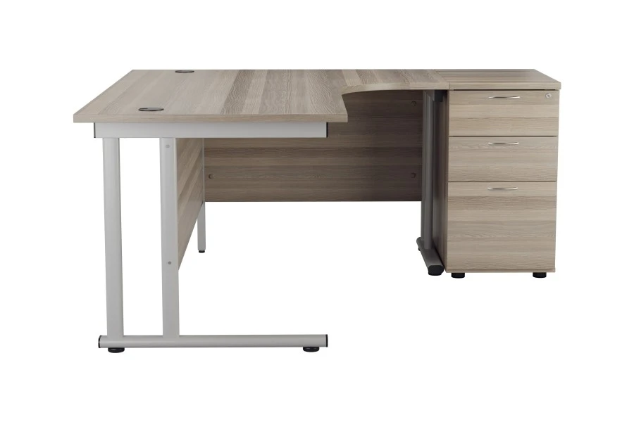 The Kestral desk also comes with a matching desk-high pedestal that fits perfectly next to the desk. It has a grey oak finish that matches the desk and creates a harmonious look. It has two box drawers and one file drawer that provide ample storage space for your documents and accessories. It has a lockable feature that keeps your belongings safe and secure. It has a scratch-resistant worktop that is ideal for placing your printer, scanner or other devices.