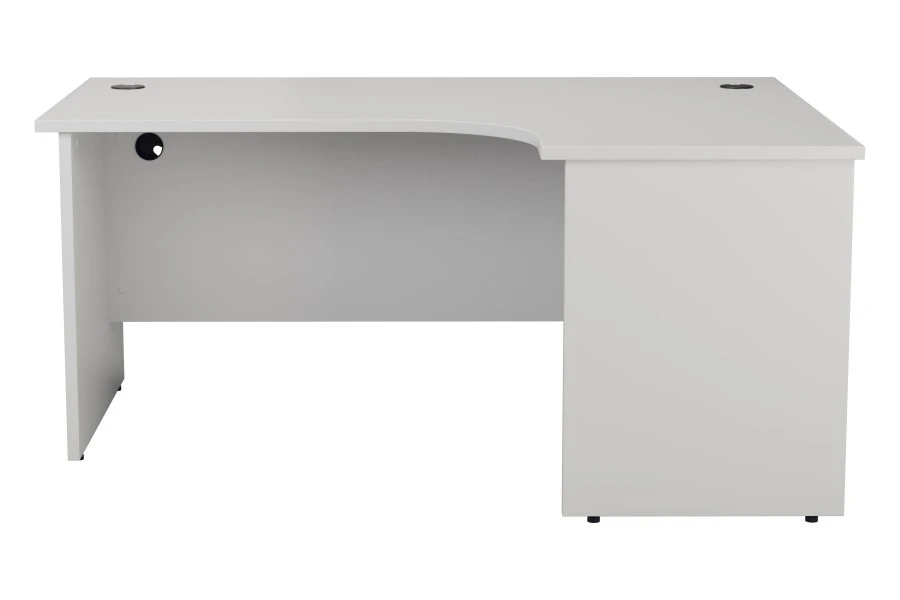 The Kestral Corner Desk has a unique crescent design that adapts to your preferences. You can choose from either a right-sided or left-sided configuration, depending on your needs and layout. The crescent shape provides an ergonomic environment for the user, allowing you to access your work area easily and efficiently.