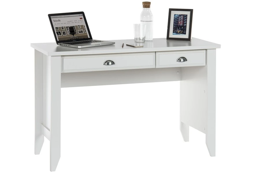 The home laptop desk in a crisp white finish with silver effect cup handles provides ample spaces for writing or computer work.