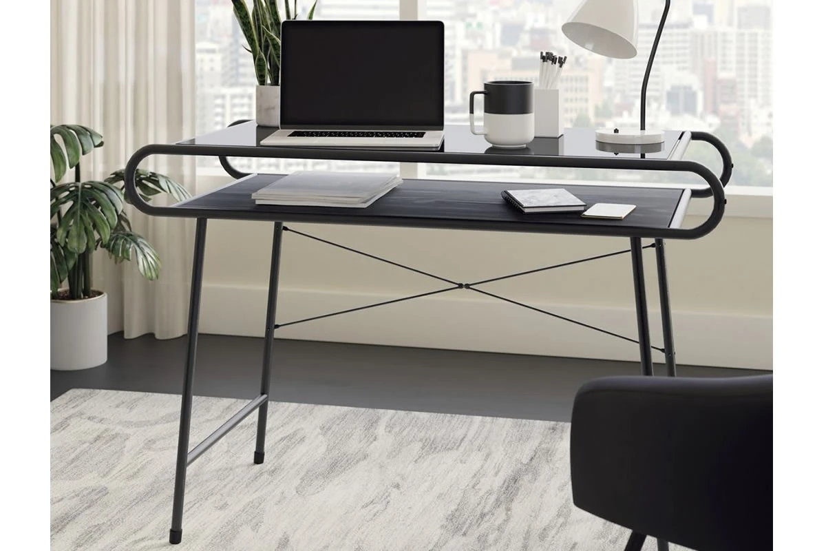This durable yet impressive desk provides a spacious work area for all manner of home office study. The neutral and sturdy black powder-coated metal frame coupled with the safety tempered black glass in Misted Elm finish desk top ensure it’s an ideal match for all rooms and colour schemes.