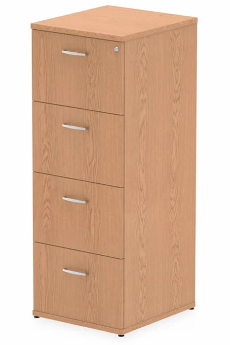 The Norton Oak 4 drawer filing cabinet is a lockable cabinet that offers you ample storage space for your files. You can store either foolscap or A4 suspension files in the four spacious drawers that are secured on metal drawer runners. The drawers have attractive metal drawer handles that complement the natural oak finish of the cabinet. The lock ensures the safety of your files and comes with two keys for your convenience.
