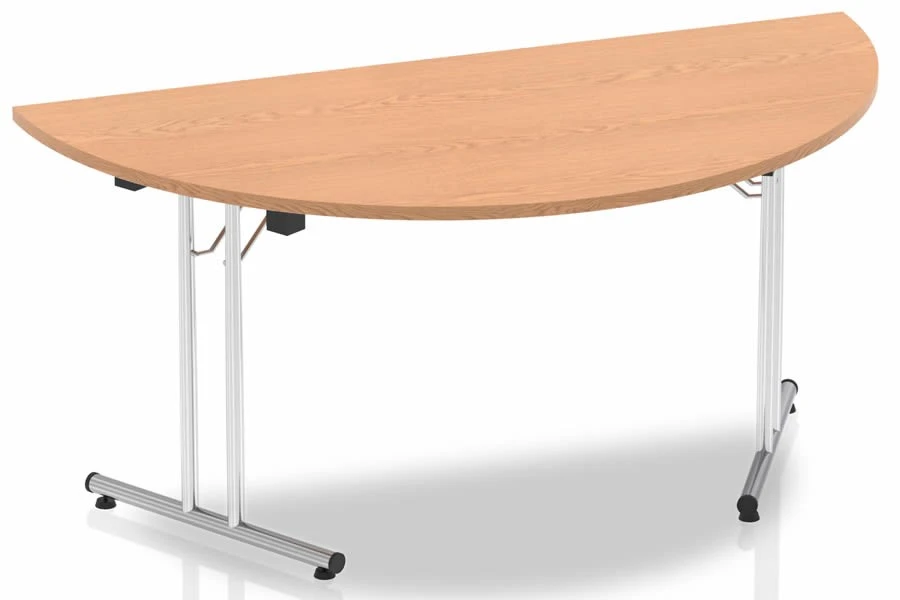 Are you looking for a meeting table that combines elegance, functionality and convenience? Look no further than the Norton Oak semi-circular 1600mm folding table. This table is the ideal solution for any office space, as it offers a stylish and durable surface that can accommodate up to six people comfortably. The top is made of 25mm thick scratch-resistant oak, with 3mm radius edging that adds a touch of sophistication and protects the edges from wear and tear. The table is supported by either a steel cantilever leg in silver or grey, or a wooden panel leg, both of which are sturdy and stable. The best part is that this table can be easily folded and stored away when not in use, saving you valuable space and time. The table also comes with a 5-year manufacturing guarantee, ensuring its quality and longevity. The table is constructed with metal to metal fixings, which means that the joints are strong and will not loosen over time. This table is not just a piece of furniture, it’s a smart investment for your office.