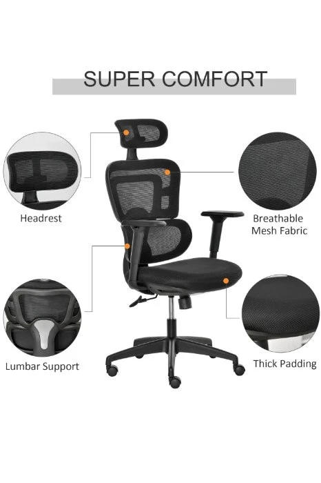 The breathable mesh backrest is fitted with a sprung lumbar panel that forms automatically into the user’s body. The backrest fully reclines and can be locked in an upright position. Increase your comfort using the fully adjustable ergonomic headrest.