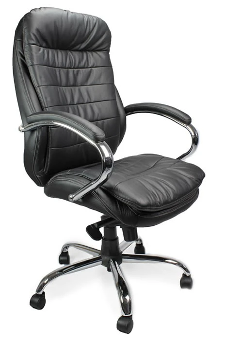Luxury executive leather faced chair in Italian leather with chrome padded arms and base. Features a gas seat height adjustment a deeply padded seat and backrest.